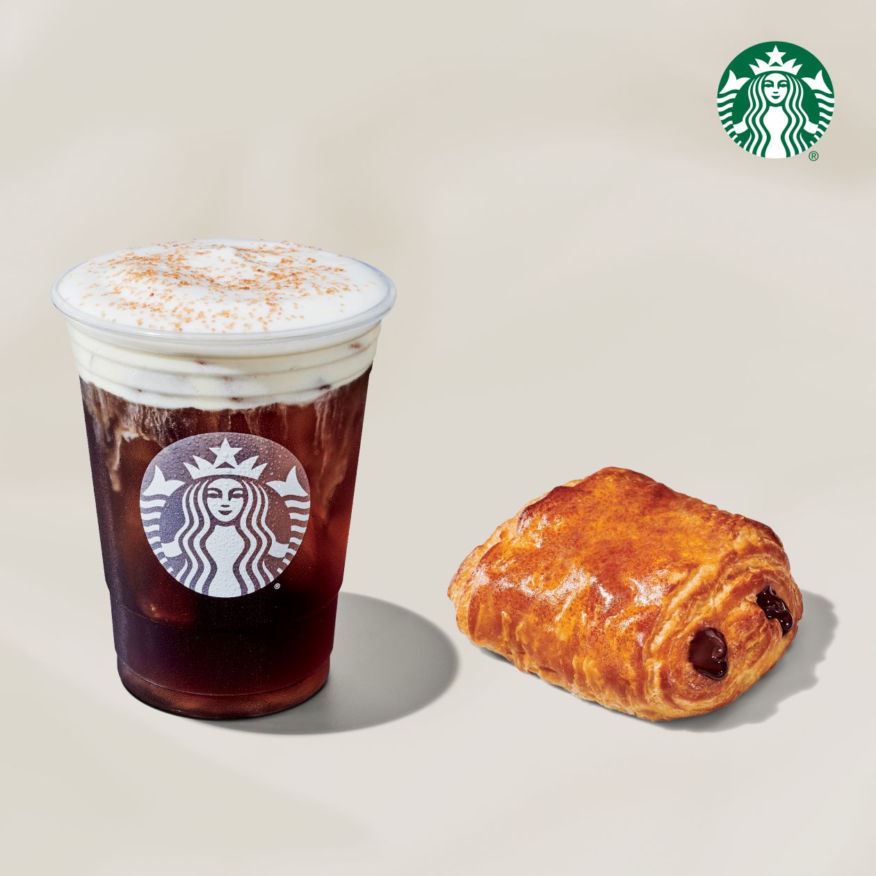A venti triple-shot blonde espresso topped with extra cinnamon dolce cold foam, lined and finished with caramel drizzle.