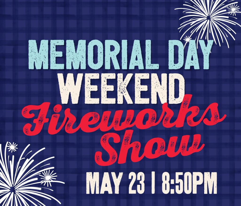 Join us for fireworks on Saturday, May 23rd, plus a weekend full of fun at our 2026 Memorial Day Weekend! Patriotic fireworks will light up the sky and can be seen throughout Downtown OWA and over Tropic Falls at OWA, creating the perfect backdrop for a classic summer night.