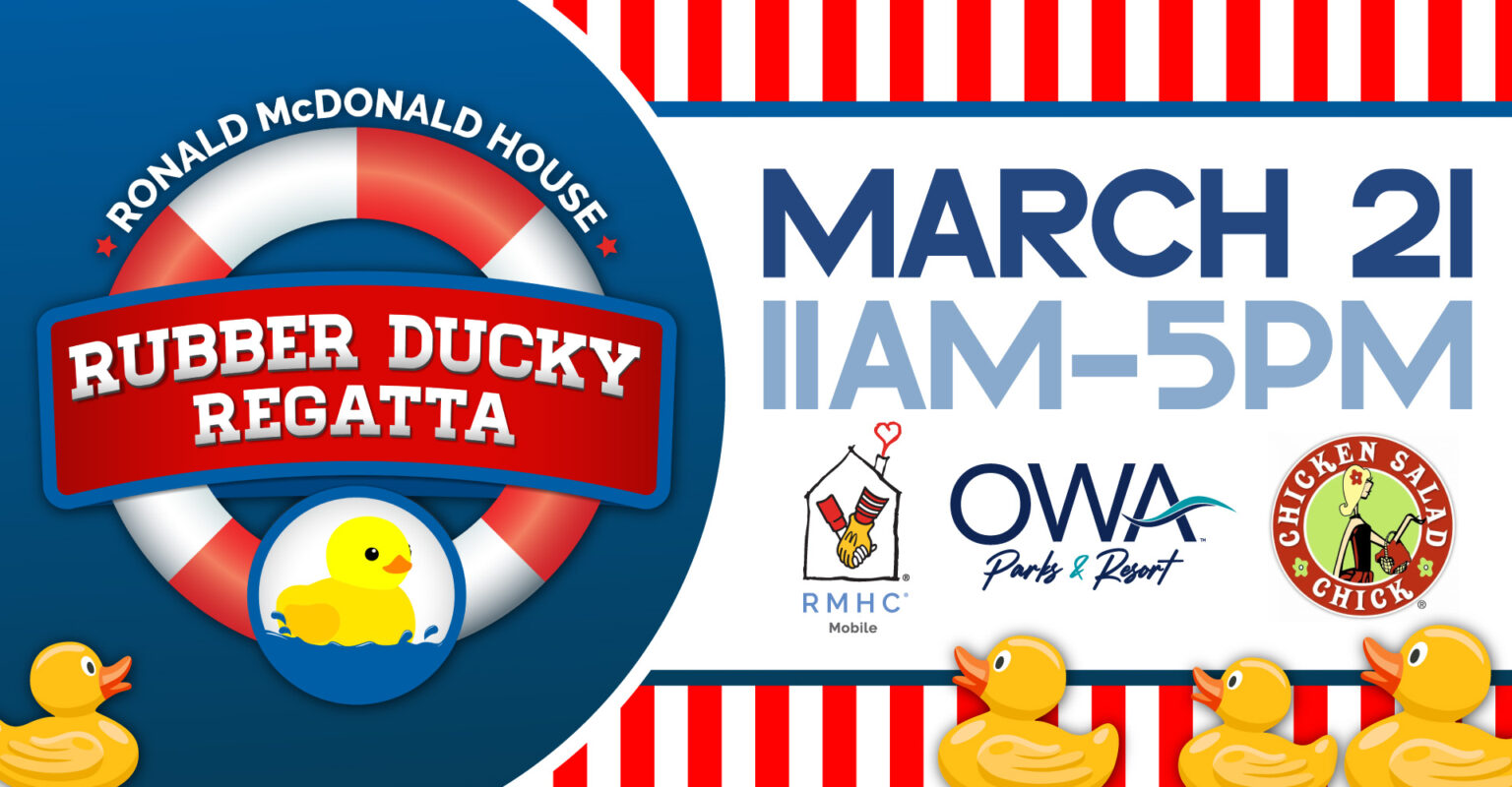 Get ready for a splash-tacular event at the RMHC Rubber Ducky Regatta, featuring exciting activities, games, and the main event… the thrilling rubber duck race across Lake OWA! On March 21st, watch as thousands of ducks paddle to the finish line, with the first three winning grand prizes for their adopters. Beyond the fun, this event supports Ronald McDonald House Charities of Mobile, which provides vital support for families with seriously ill or injured children. Adopt a duck, enjoy the festivities, and make a difference!