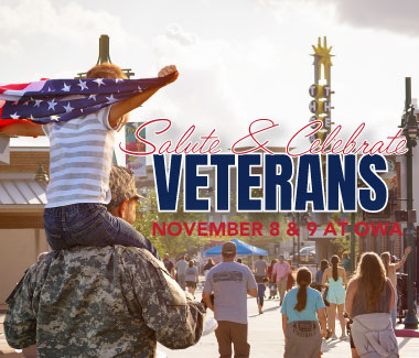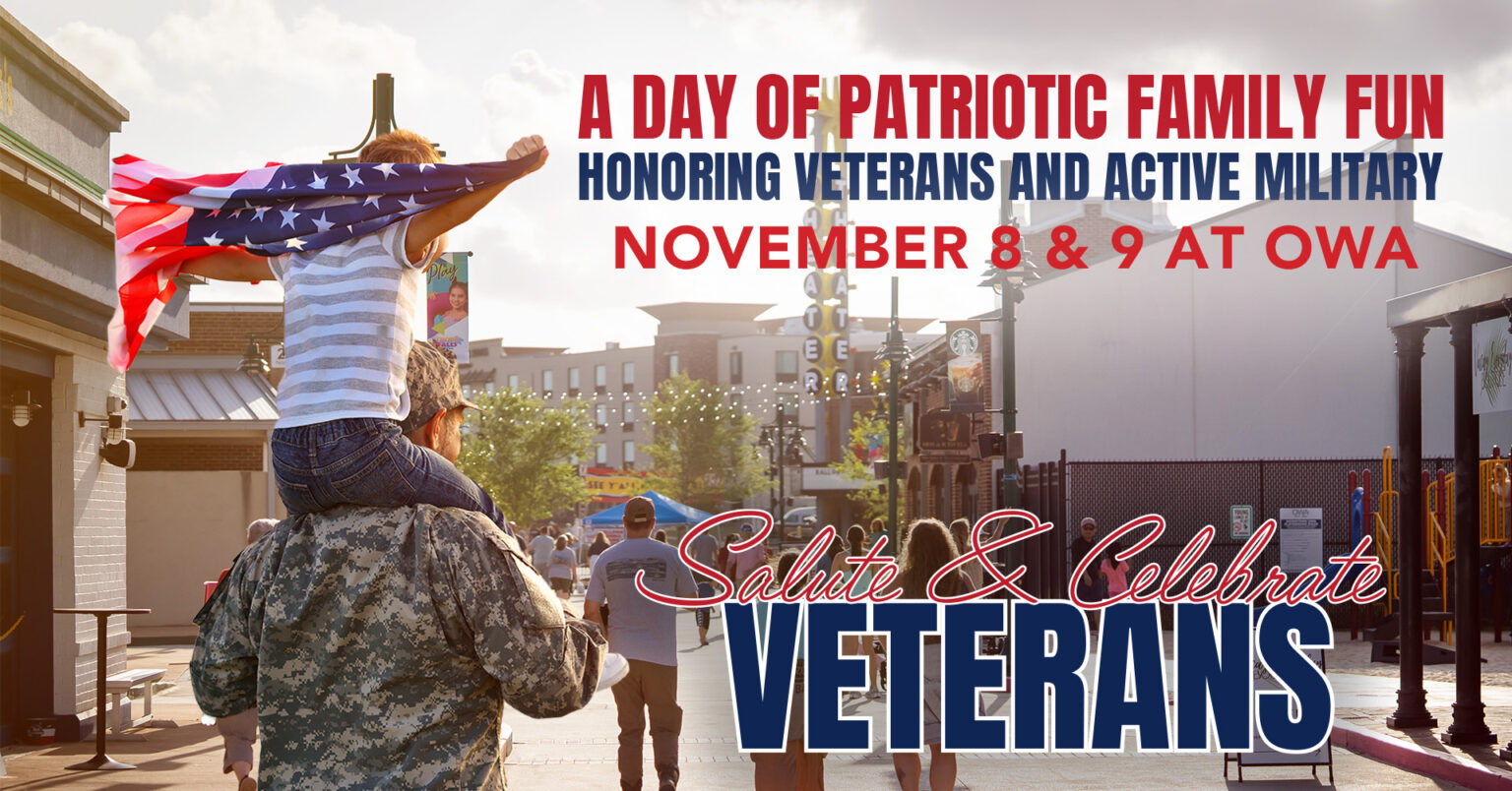 Join us in Downtown OWA on November 8th & 9th for Salute & Celebrate, a full weekend honoring our veterans and active military! Kick off the morning with a presentation of colors, the National Anthem, and a moving recognition of heroes on OWA Island. Then explore patriotic fun across Downtown, from thank-you note writing and the Wall of Honor to dog tag decorating, themed photo ops, and inflatable challenges inspired by military training. Stick around for a live performance from local bands playing classic rock, country, & patriotic tunes as we come together to salute those who serve.