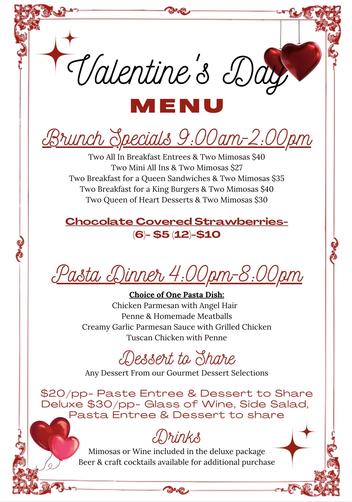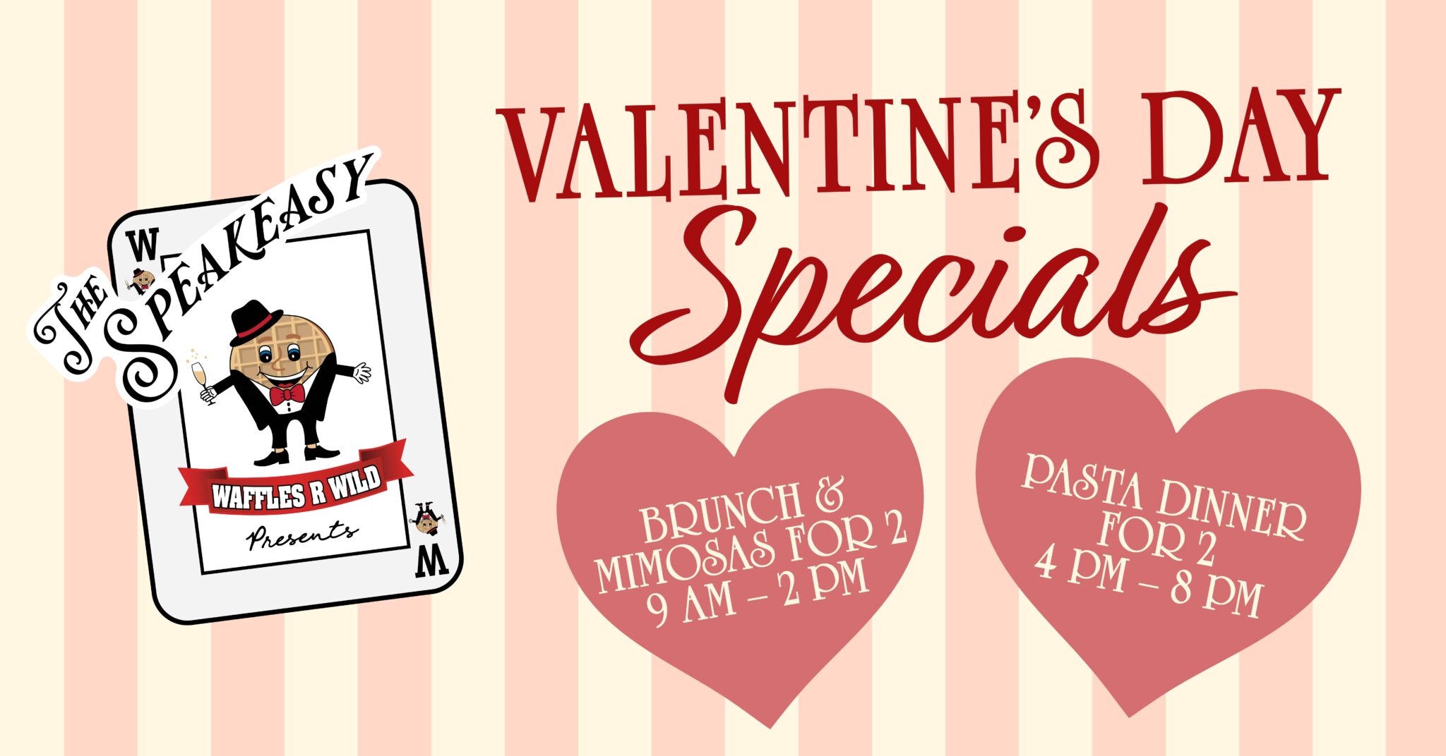 Waffles R Wild is serving up Valentine’s Day specials all day long on February 14th! Start the day with Valentine’s Brunch & Mimosas from 9:00 am to 2:00 pm, featuring sweet and savory favorites perfect for a relaxed morning date.
